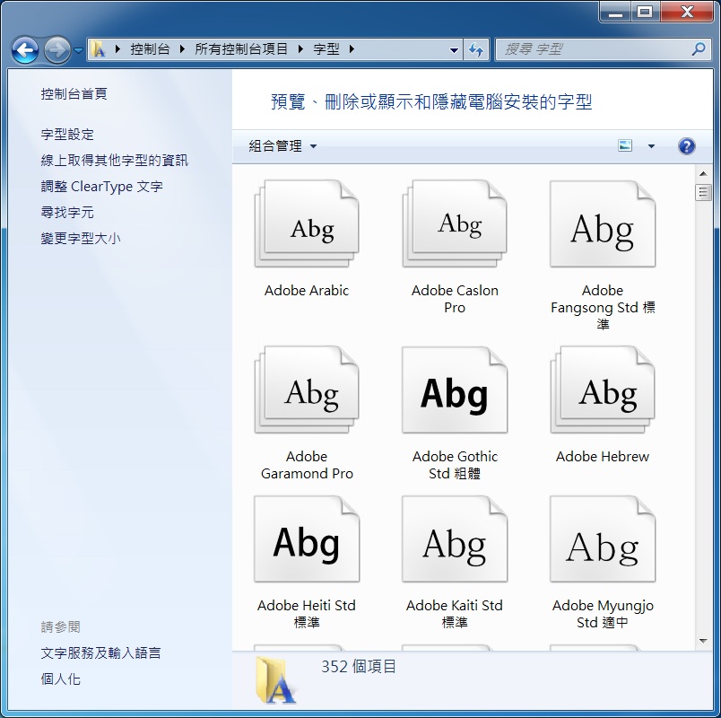 五、可以加入「字型」的畫面出現了。 把你的字型檔用拖移或複製貼上的方法加入進去。 「就是把 檔案(第二張圖) 拖移到 控制台字型(第一張) 或者把 檔案(第二張圖) 複製到控制台字型(第一張) 貼上」